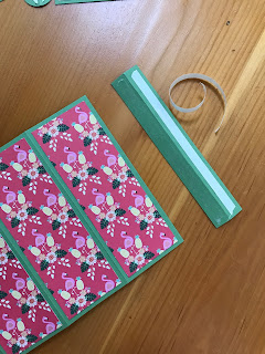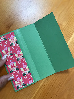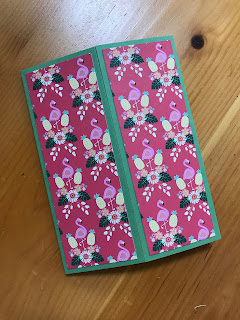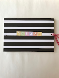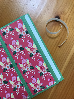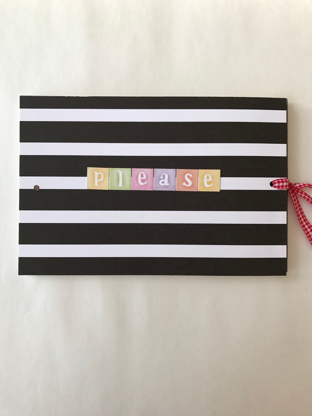4. I pre-marked where the holes on the book cover would fall on the patterned panels and punched those holes out. Then I adhered the covers and added a little gingham ribbon through the hole. The book is now ready to be wrapped as a gift. Here's the finished front.